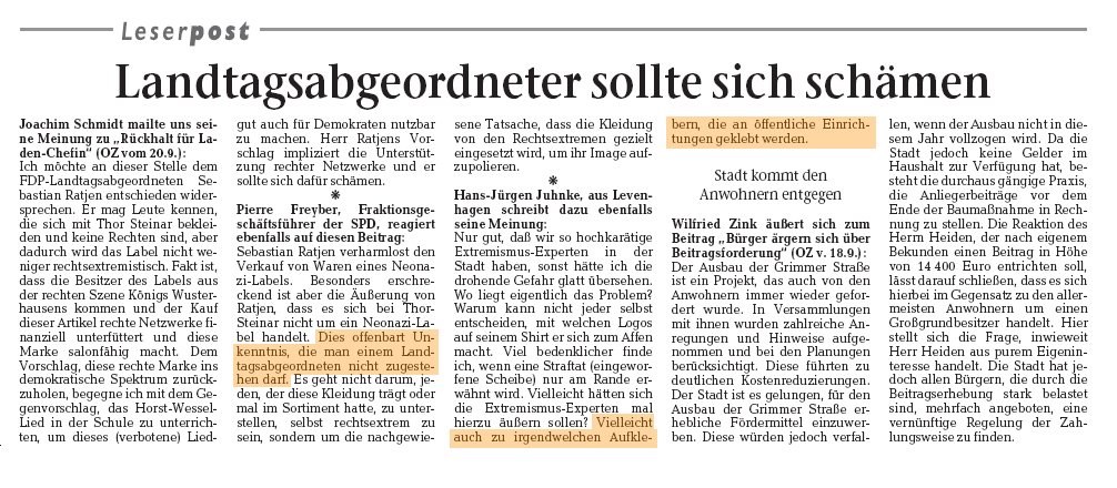 Ohnehin kriegt er gerade mächtig Schelte. Nachdem die Ostsee Zeitung den gestern flugs gemailten Leserbrief heute druckte und die Leserbriefe überschrieb mit Landtagsabgeordneter sollte sich schämen, äusserte sich auch der Fraktionsgeschäftsführer der SPD, Pierre Freyber, zu Ratjens Kommentar: „Sebastian Ratjen verharmlost den Verkauf von Waren eines Neonazi-Labels. Besonders erschreckend ist aber die Äußerung von Ratjen, dass es sich bei Thor-Steinar nicht um ein Neonazi-Label handelt. Dies offenbart Unkenntnis, die man einem Landtagsabgeordneten nicht zugestehen darf.“