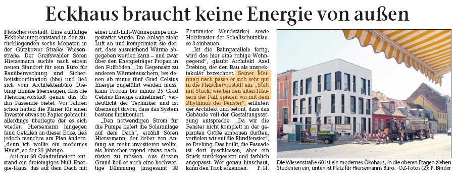 Gestern erschien dazu ein Interview in der Ostsee Zeitung. Darin wird Architekt Axel Drebing zitiert, der den Bau als unspektakulär bezeichnet. Seiner Meinung nach passe er sich sehr gut in die Fleischervorstadt ein und entspreche voll der Gestaltungssatzung: „Statt mit Stuck, wie bei den alten Häusern der Fall, spielen wir mit dem Rhythmus der Fenster.“