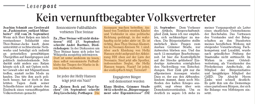Im Leserbrief heißt es: „Die Aussagen machen betroffen. Anhand von Textilien werden Käufer und Verkäufer in eine politische Richtung gedrängt, in der wahrhaftig nicht jeder aktiv ist. Es ist richtig, dass Thor-Steinar-Klamotten in Neonazi-Kreisen Nr. 1 sind. Aber auch Kleidung von Helly Hansen steht aufgrund der Abkürzung HH oben auf der Liste der Neonazis. Sind jetzt alle Sportler, insbesondere Segler, die Helly Hansen tragen, Nazis? Ist jeder, der ein Kopftuch trägt, Terrorist?“