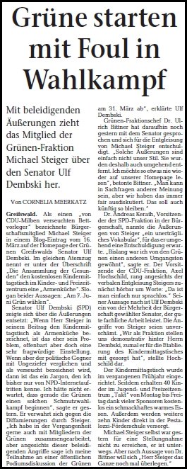 Pikant an der Angelegenheit ist, dass unlängst — genau am 23.Februar — in der Bürgerschaft aus den Reihen der CDU der Satz „Den Steiger soll man lieber aus der Stadt jagen“ gefallen sein soll. Von dieser Entgleisung erfuhr man nichts in der Zeitung, lediglich im Blog der Grünen. Die Lokalzeitung hievte das Thema ihrerseits auf die erste Seite und versehen es mit der sportiven Überschrift Grüne starten mit Foul in Wahlkampf.