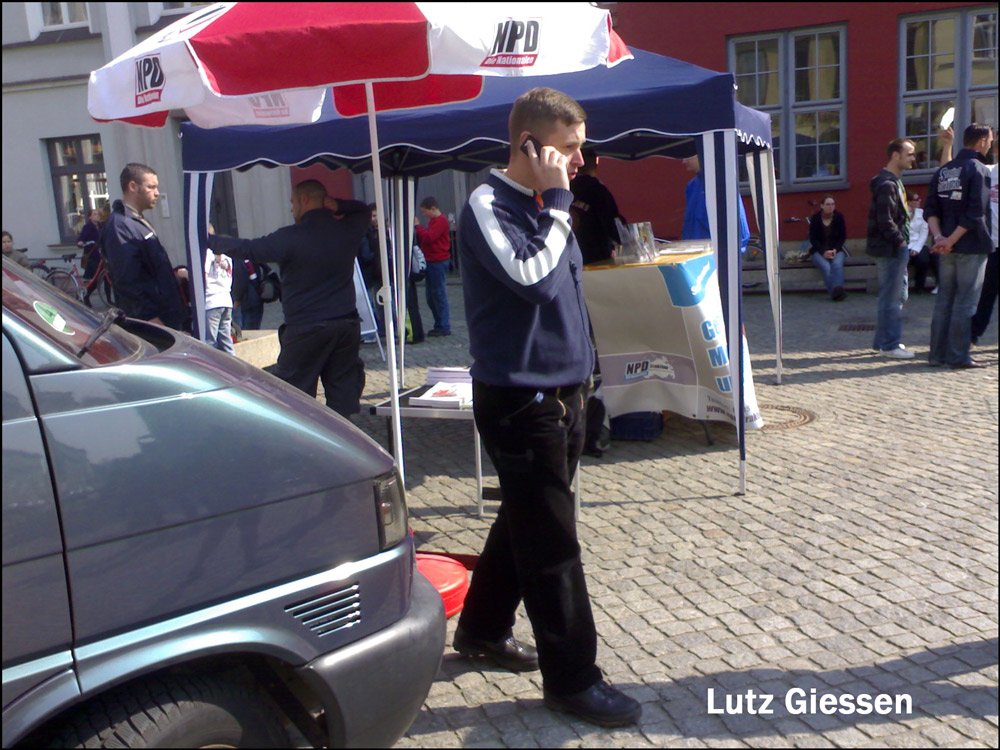 Wie gestern Abend noch eilig angekündigt, trafen heute früh wenig zahlreich Anhänger der rechtsextremen NPD auf dem Fischmarkt in Greifswald ein, um einen Infostandt aufzubauen und Flyer zu verteilen.