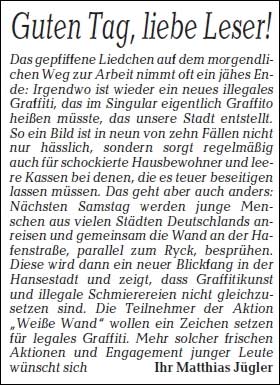 Leider scheint die Assimilation in die Lokalredaktion und die Anpassung an den vorherrschenden Wertekanon schneller abzulaufen, als ich vermutete. J. kam heute die zweifelhafte Ehre zuteil, Guten Tag, liebe Leser! zu gestalten. Es ging diesmal weder um Hundekot noch um Pedalritter Fahrradfahrer, nicht um Schandflecken oder Falschparker. Heute wurde sich wieder im publizistischen Greifswalder Lieblingsvolksport geübt: dem Graffiti-Bashing.