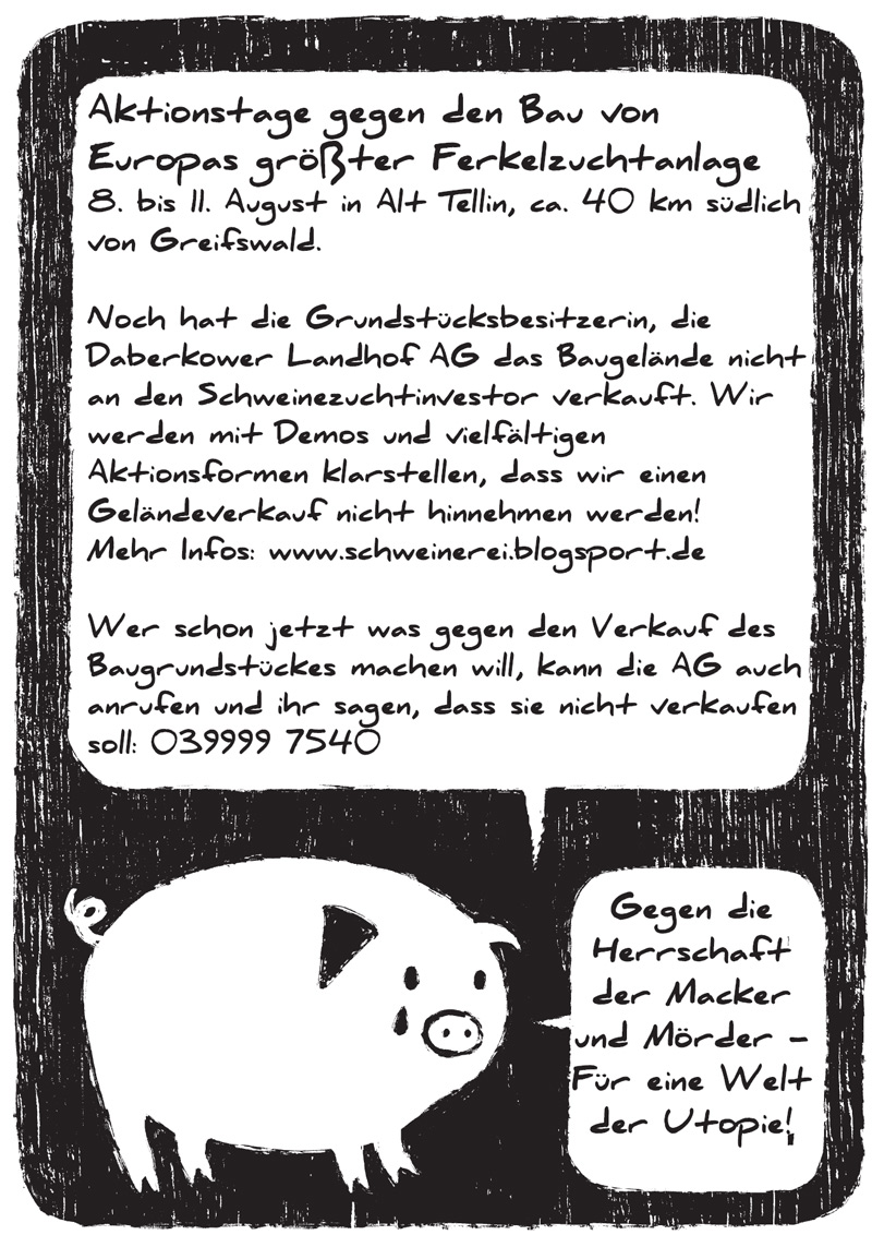 In den vergangenen Wochen drängten die Gegner der geplanten Ferkelzuchtanlage in Alt Tellin erfolgreich in die Öffentlichkeit. In dem unweit von Demmin gelegenen Ort soll nach dem Willen eines niederländischen Investors die größte Ferkelzuchtanlage Europas entstehen.