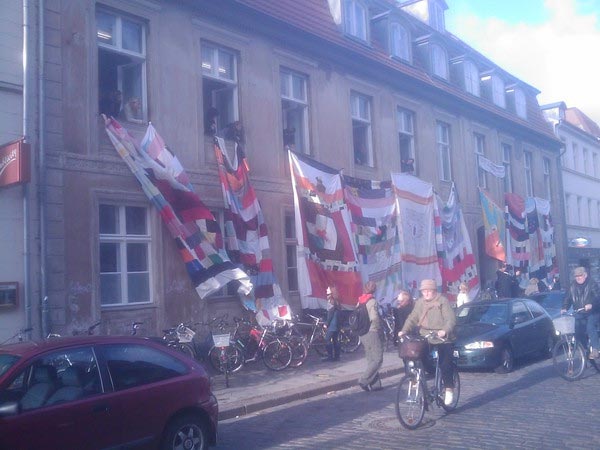 Studenten verhüllten dort um 12 Uhr ihr Institut mit gemeinsam angefertigten Patchwork-Decken (Patchwork statt Flickwerk!), ganz wie Christo und einst Jeanne-Claude. Nur zwei Stunden später veröffentlichte Gabriel Kords einen kurzen Artikel, angereichert mit einer umfangreichen Bildergalerie und einem kurzen Video.