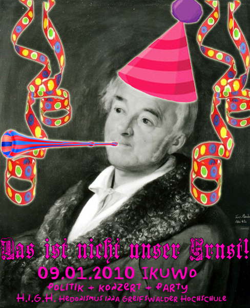 Die Sektion “HiGH” (HedonistInnen inna Greifswalder Hochschule) kann die Auseinandersetzung vielleicht mit ihrer Wahlerinnerungsparty auflockern, die unter dem Motto Das ist nicht unser Ernst! stattfinden wird.