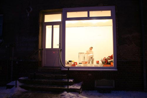 Winterlich war es höchstens vor der Alten Bäckerei, denn die Tür war verschlossen und man musste mit einem Stehplatz vor dem Schaufenster vorlieb nehmen. Drinnen knüpfte Sonja Grädler an ihre Bewegungsperformance vom 2. April des vergangenen Jahres an. Damals machte sie ihre Leidenschaft für Schuhwerk zum Gegenstand ihrer Kunst und beschäftigte sich und das Publikum drei Stunden mit Anzieh- und Gehproben.