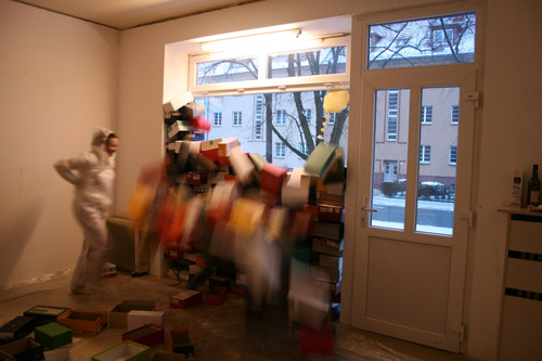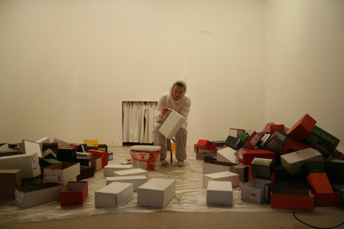Vorgestern waren keine Schuhe im Spiel, dafür eine gehörige Menge Schuhkartons. Nachdem der Blick durch das Schaufenster anfänglich von einer Kartonwand verstellt war, wurde die papierne Mauer recht bald eingerissen und Grädler machte sich – mit einem hellen Overall bekleidet – ans Werk, jeden einzelnen Karton mit weißer Farbe zu bemalen und die fertigen Stücke neu aufzustellen. Irgendwann muss alles eins geworden sein, der weiße Raum, die Künstlerin im hellen Overall und die kreidebleichen Schuhkartons. Wunderbar.