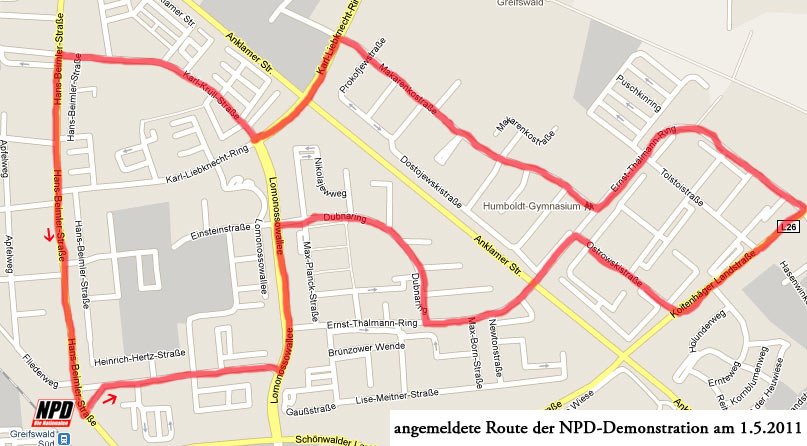 Einem anonymen Hinweis zufolge, soll die Demonstration am Greifswalder Südbahnhof beginnen und über die Beimler- und Hertzstraße zur Lomonossow-Alle führen. Von dort geht es über den Dubna-, Thälmann- und Liebknechtring durch die Krullstraße zurück auf die Beimlerstraße und schließlich wieder zum Südbahnhof.