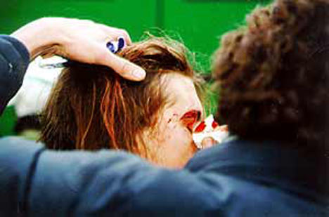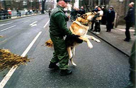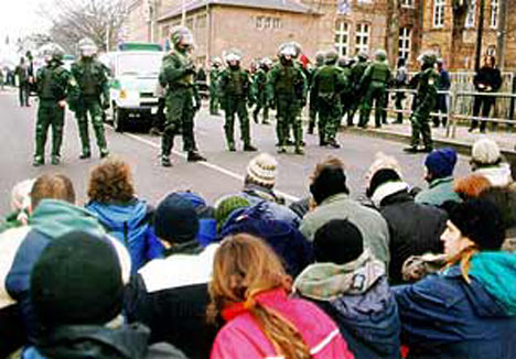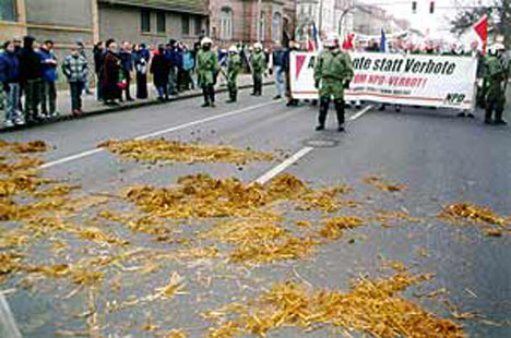 „Zu der offiziellen Gegendemonstration kamen, für viele sehr überraschend, über 7000 Leute zusammen. Da diese Demo an keiner Stelle in die Nähe der NPD-Demo langführte, hielten sich viele Menschen in der Nähe der NPD auf. Etwa 50-60 Menschen versuchten, die Straße zu blockieren, um den Nazi-Aufmarsch aufzuhalten. Die Polizei, sichtlich kopflos und unprofessionell, räumte die Blockade mit einer absolut überraschenden Brutalität. Auch zwei weitere Blockadeversuche einige Meter weiter wurden sofort und brutal abgeräumt. Dabei wurden einige Teilnehmerinnen verletzt und insgesamt zwölf Menschen verhaftet. Von der Reaktion der Polizei überrascht kamen keine weiteren Sitzblockaden mehr zustande und die Nazis konnten ihren Aufmarsch (unter phantasievollem Protest) zu Ende führen. Trotzdem gelang es einigen Leuten noch, Pferdemist auf der Straße zu verteilen.