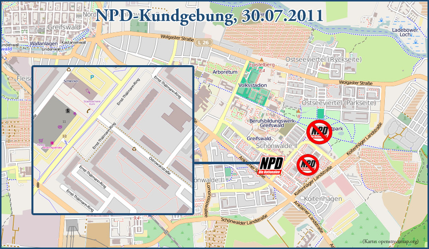 Gestern Nachmittag wurde bekannt, dass die NPD für Sonnabend eine Versammlung in Greifswald angemeldet hat. Diese Anmeldung erfolgte fristgerecht und die Veranstalter sollen die erwartete Teilnehmerzahl auf 50 Personen taxiert haben.