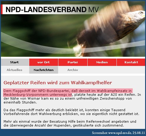 Bei dem Fahrzeug handelt es sich um einen liebevoll Flaggschiff Waterkant Mercedes-Transporter, der in den vergangenen Wochen auf unzähligen NPD-Wahlkampfterminen zu bestaunen war — in Greifswald zuletzt am 10. August auf dem Fischmarkt. Die Aufnahmen von Greifswald TV belegen das, kategorischer Ausschluss hin oder her. Und nicht zuletzt dokumentieren auch die eigenen Pressemitteilungen der NPD-Fraktion den Einsatz des Fahrzeugs zu Wahlkampfzwecken. Sollten sich die Vorwürfe bestätigen, muss die NPD mit einer weiteren Strafzahlung rechnen.