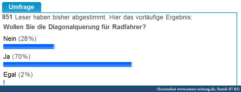 Erfahrungsgemäß wird das Ergebnis dieser nichtrepräsentativen Umfrage in den nächsten Tagen die erste Seite des Greifswalder Lokalteils schmücken und vermutlich orientieren sich dann auch Vertreter der kommunalen Politik daran, wenn sie versuchen, die Einstellung der Greifswalder Bevölkerung zu diesem Thema einzuschätzen. Deswegen seien alle gebeten, sich ausnahmsweise an dieser Umfrage zu beteiligen, damit die rauschhaften 70% gehalten werden können und vielleicht doch noch etwas passiert!