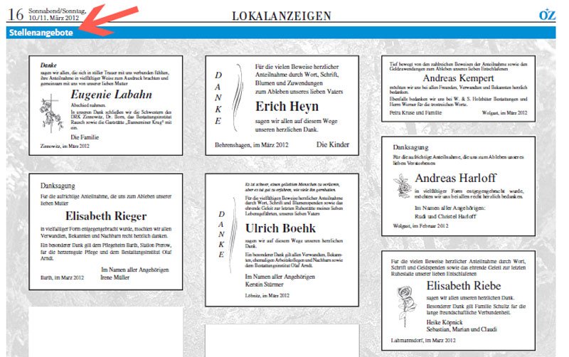 Ostsee-Zeitung patzt mit den Todesanzeigen Todesanzeigen als Stellenangebote zu deklarieren, entbehrt nicht einer gewissen Ironie. Der Fauxpas des Wochenendes. (Ostsee-Zeitung, 10/11.03.12)