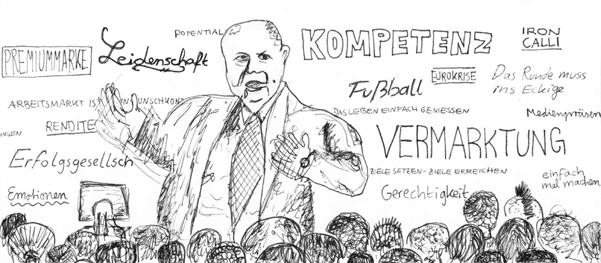 Alle Kompetenz sei jedoch ein trauriger Furz, wenn man nicht mit Leidenschaft bei der Sache ist. Blutleere Experten, notorische Nörgler, griesgrämige Pessimisten und behäbige Chefbedenkenträger gehen für ihn gar nicht klar. Schon ein einziger solcher Schubladenbewohner zieht zehn andere mit in den Sumpf. Da hilft nur eins: Stecker aus dem Arsch oder in die Tonne feuern. Ein fauler Apfel und der Korb ist hin. Er gestikuliert wüst. Er schlägt die Faust in die Hand und den Nagel in die Wand. Wer etwas erreichen will, muss Dreck fressen. Und das heißt für den kleinen Mann: Auch mal eine 60-Stunden-Woche hinnehmen. Und nicht so viel motzen, immerhin ist der Arbeitsmarkt kein Wunschkonzert. Vereinzeltes Stirnrunzeln aus dem Zuschauerraum.
