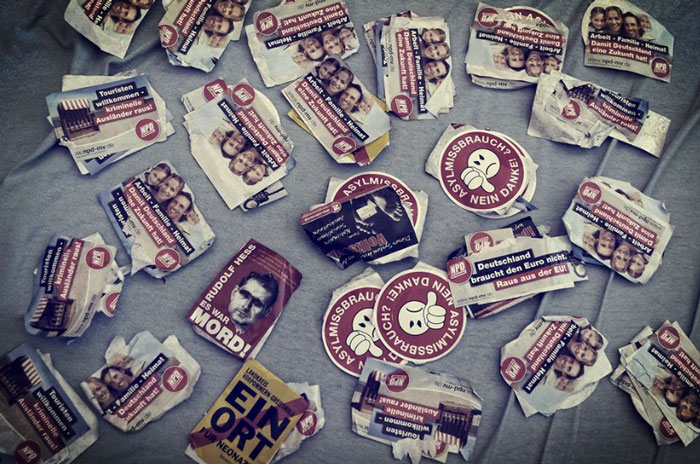Nachdem in der vergangenen Nacht viele NPD-Plakate wieder so schnell verschwunden sind, wie sie angebracht wurden, ist anzunehmen, dass sich die hippen Antifaschistinnen einen nicht unerheblichen Startvorteil gesichert haben — ihr bei Facebook veröffentlichtes Foto der bisherigen Ausbeute zeigt, dass sie beim gegenwärtigen Punktsystem (ein Nazi Sticker = ein Punkt, ein Nazi Plakat = 5 Punkte, 1 Nazi Sticker überklebt = 2 Punkte) schon gut vorgelegt haben. Wer da noch mitziehen möchte, sollte sich jetzt sputen — am Hansering und den Ausfallstraßen der Stadt gibt es noch ein paar Punkte zu holen!