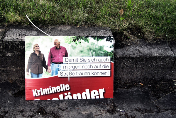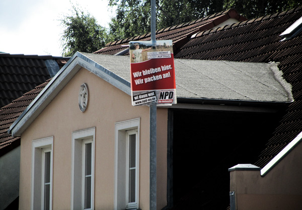 Überhaupt mag die Nörgelei darüber, wie die Parteien um die Gunst ihrer Wähler buhlen, seit Wochen nicht abbrechen. In den Feuilletons wird nimmermüde gepredigt, dass die deutsche Bevölkerung den Wahlkampf abkriegen würde, den sie verdiene. Das klingt erstmal einleuchtend, nur bleibt dieser Satz eine Antwort auf die Frage schuldig, womit man so einen 15-20 Personen zählenden Neonazi-Mob verdient hat, wie er gestern Nacht mit Kleintransportern durch Greifswald fuhr und Plakate der NPD aufgehängte. Dabei wurden auch die Werbemittel der demokratischen Parteien in Mitleidenschaft gezogen, die mit Aufklebern überklebt und zum Teil auch entfernt worden sein sollen. Über Twitter wurde zur Umsicht gewarnt, Neonazis würden in Fahrzeugen patrouillieren.