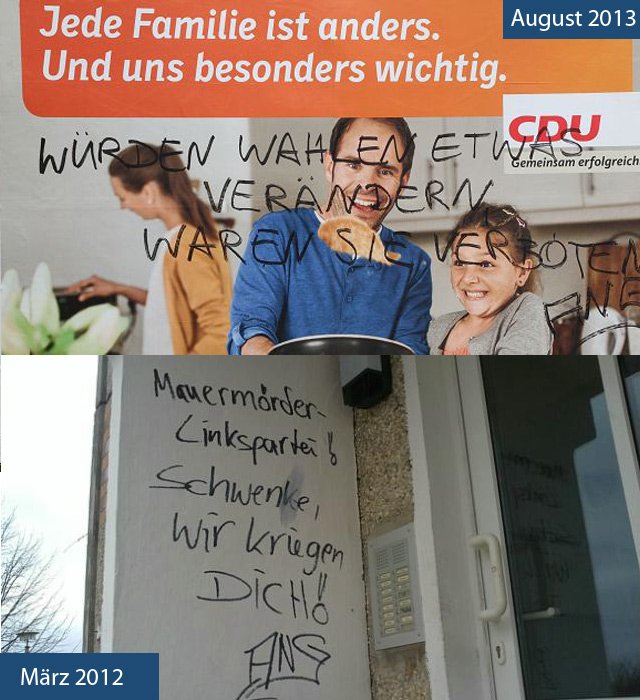 In Verbindung mit ihrem Kürzel verwendeten die Autonomen Nationalisten Greifswald das Wort „Mauermörder“, wie es seit gestern Nacht auf einem Plakat der LINKEN zu lesen ist, schon einmal im März 2012. Damals besprühten sie den Hauseingang der Landtagsabgeordneten Mignon Schwenke (DIE LINKE) mit einer deutlichen Drohung („Mauermörder-Linkspartei! Schwenke, wir kriegen dich!“). Auch diese Tat fand Eingang in den Verfassungsschutzbericht 2012.
