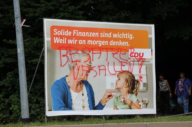 In Grimmen finden sich auch beschmierte Großplakate demokratischer Parteien mit der Aufschrift „Besatzer-Vasallen“, z.B. im Stadtteil Südwest beim Aldi.