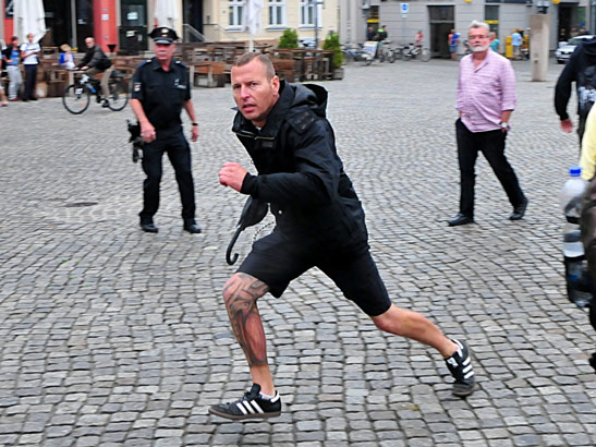 Die Aufnahmen zeigen, wie sich mehrere Neonazis, darunter auch die Lebenspartnerin von G., in die Menge bewegen und gezielt auf einen Antifaschisten zusteuern. Dieser kann jedoch rechtzeitig weglaufen und ist auch durch Alexander Wendt (Landesvorstand NPD), der dem Fliehenden einen Regenschirm hinterherschleudert, nicht mehr zu stoppen. Mehrere NPD-Anhänger nehmen die Verfolgung auf und auch einige Antifaschisten laufen in Richtung Knopfstraße — womöglich, um einen zu befürchtenden, gewaltsamen Übergriff zu verhindern. Wie das Video dokumentiert, bricht Marcus G. relativ schnell die Verfolgung ab und wendet sich wieder der Marktmitte zu, wo er einen nacheilenden Demonstranten zu Fall bringt und sich anschließend schnell entfernt — wohlgemerkt ohne den Versuch zu unternehmen, jemanden „dingfest zu machen“.