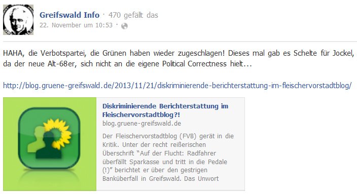 Das Ergebnis solcherlei Textproduktion habe man an Kommentaren bei Facebook ablesen können, in denen von einem “umweltfreundlichen Banküberfall” die Rede gewesen sei. Die Grünen hätten sich fragen lassen müssen, ob sie nicht schon immer „prinzipiell für Umverteilung“ gewesen seien und es sich bei dem Banküberfall nicht um eine „Versöhnung von Ökologie und sozialer Gerechtigkeit“ gehandelt hätte. Weil dann auch noch die Bürgerinitiative für die Diagonalquerung diskreditiert wurde („der Räuber sei quer über die Europakreuzung gefahren“), reichte es den linken Ökospießern: Sie entschieden sich für härtere Methoden und forderten vom Fleischervorstadt-Blog, dass dieser sich an den eigenen Maßstäben in Sachen Political Correctness messen ließe.