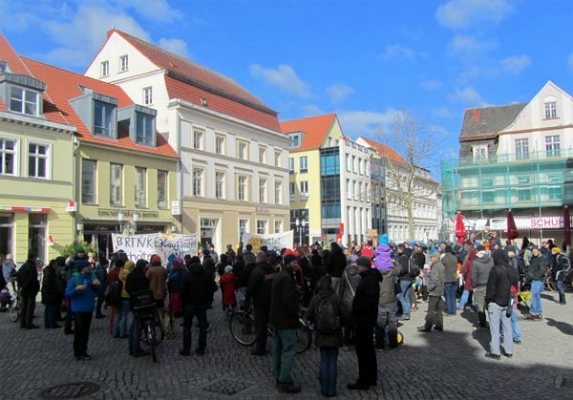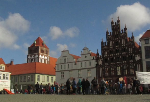 Bei bestem Frühlingswetter trafen sich am heutigen Vormittag mehr als 120 Greifswalder auf dem Fischmarkt, um gemeinsam für den Erhalt des vom Abriss bedrohten Häuserensembles in der Brinkstraße 16-17 zu demonstrieren.