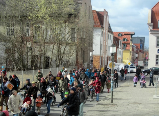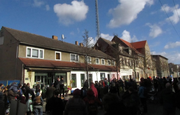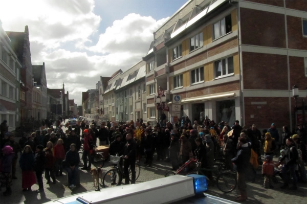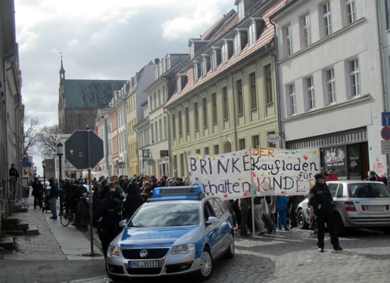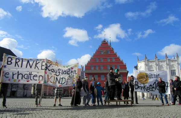 „Bei bestem Frühlingswetter trafen sich am heutigen Vormittag mehr als 120 Greifswalder auf dem Fischmarkt, um gemeinsam für den Erhalt des vom Abriss bedrohten Häuserensembles in der Brinkstraße 16-17 zu demonstrieren. Nach der Auftaktkundgebung zog der in jeder Hinsicht vielfältige und schließlich auf über 200 Personen angewachsene Demonstrationszug durch die Innenstadt“