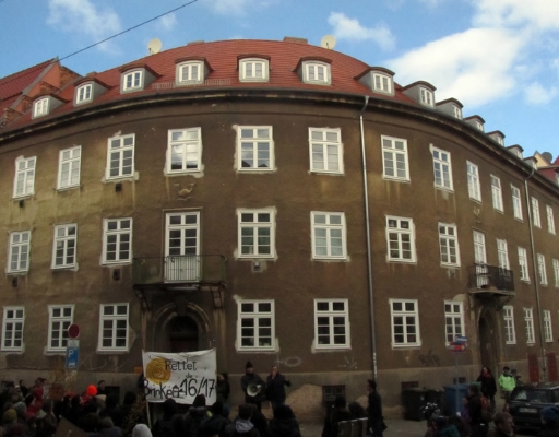 Diese Strecke war keineswegs willkürlich gewählt; vielmehr führte sie die Protestierenden an weiteren bedrohten — oder sogar bereits abgerissenen Häusern — vorbei, über deren jeweilige Situation in kurzen Redebeiträgen aufmerksam gemacht wurde. Darunter waren das Geburtshaus der immer populärer werdenden Barockdichterin Sibylla Schwarz in der Baderstraße, das Eckhaus Steinbecker Straße / Loeffler-Straße, die Baulücke Loeffler-Straße / Knopfstraße, wo bis vor kurzem noch ein Teil der Käthe-Kollwitz-Schule stand, sowie das markant-rundliche Eckhaus Burgstraße / Arndtstraße, das schon heiß als nächster Kandidat für eine Luxussanierung gehandelt wird.