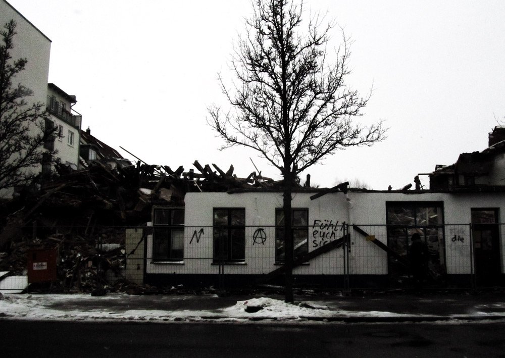 Nach mehrwöchiger Besetzung eines Gebäudeteils wurde die Brinkstraße im November letzten Jahres geräumt; nach den dabei erfolgten Zerstörungs- und Abrissmaßnahmen auf der Rückseite des Objekts verblieb nur noch der Bioladen Sonnenmichel — der nun ebenfalls umgezogen ist — im Ensemble. Heute wurde das Vorderhaus in der Brinkstraße 16/17 dem Erdboden gleichgemacht.