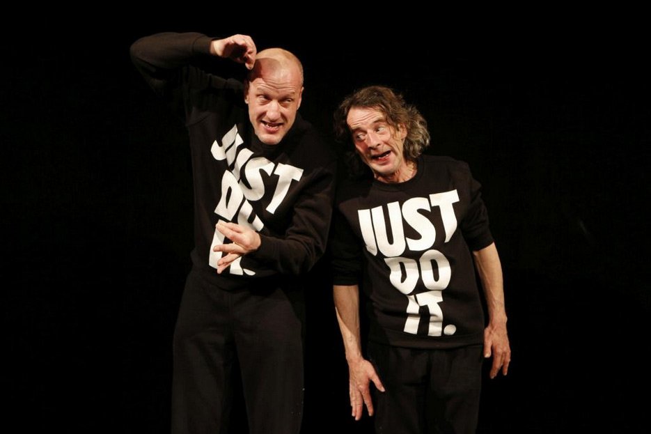 Vielmehr sind es die anderen Kopisten, die in ihrem eifrigen Gerödel an den endlos kritzelnden Schreibtischen das Groteske im Abreiten der Arbeit deutlich machen. Diesen beiden Figuren und ihrer inneren Grobschlächtigkeit widmet die Inszenierung in Schlüsselszenen einen eigenen, beklemmend kleinen Raum dicht am Publikum — der Bühnenvorhang wird kurzerhand heruntergelassen und so eine andere, auch eine Meta-Ebene geschaffen. Vor ihm stehen sie wie Rummelkasper eines schiefschrötigen Varieté-Theaters: sabbernd mit Zitronen im Mund. Sie kichern, krähen, kalauern und schlagen sich schließlich wiehernd die Köpfe an der Wand ein. Sie leiden und zerbröckeln an Bartlebys Gleichgültigkeit am meisten. Sie sind das Sinnbild für das Zermahlenwerden des Individuums in der Mühle stumpfer Arbeit im Rhythmus des oft berufenen Turbokapitalismus. Auf ihren Pullovern steht der allbekannte Slogan eines Turnschuhherstellers: „Just Do It“.