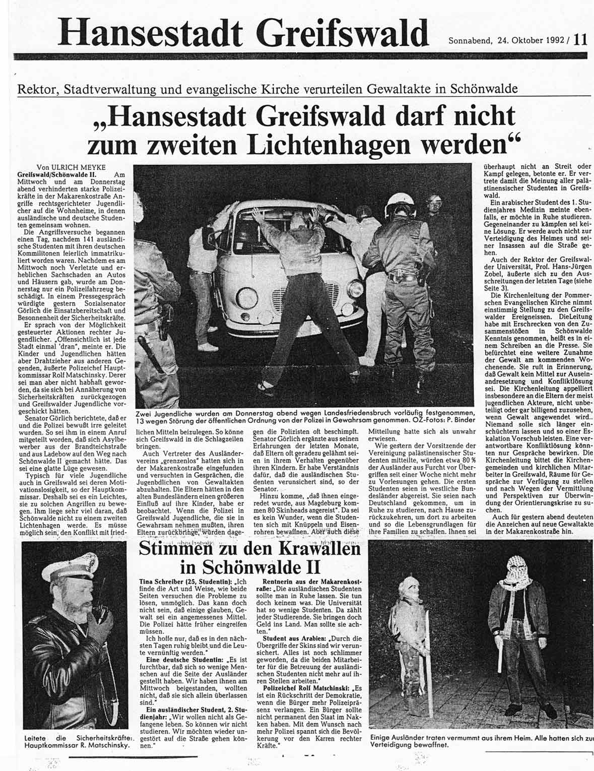 FLV: Fremdenfeindliche Gewalt entlud sich im Oktober und November 1991 mit einer bis dahin in Greifswald ungesehenen Heftigkeit, die dann ein Dreivierteljahr später von Rostock Lichtenhagen übertroffen wurde.