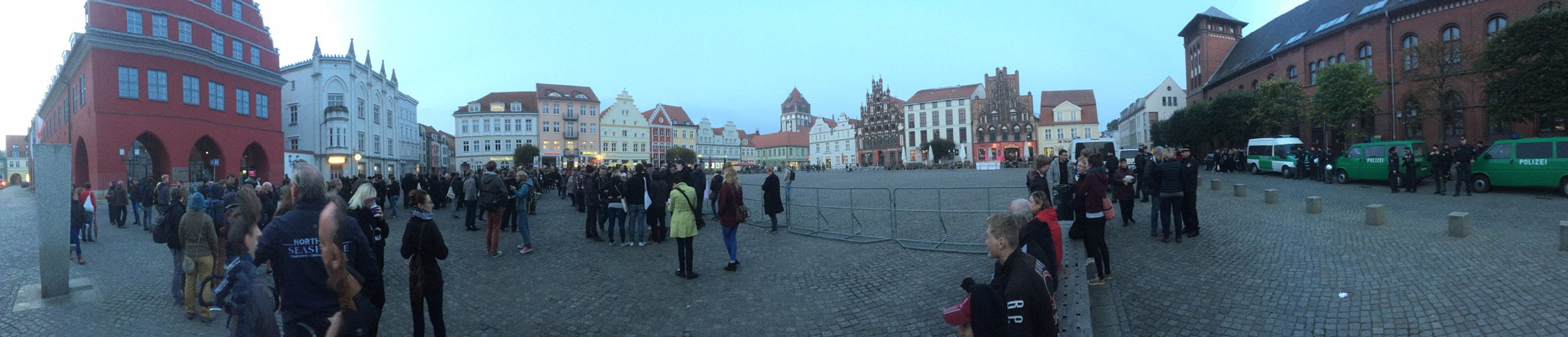 Aber was nützt die beste Idee, wenn kein Schwein kommt? Eine bessere Idee mußte her; und sie fanden sie. Für die dritte „Montagsdemo“ der Wüstenfüchse und Friedenstauben gründete sich eine neue Seite mit dem „harmloseren“ Namen „Frieden, Freiheit, Demokratie, Gerechtigkeit“. Aber auch dort geistert das Nazithema umher. Vor allem aber fanden sie eine ganz große Inszenierung. Diesmal waren es etwa 80. Rund 120 Polizisten aus über 12 Polizeifahrzeugen mit Schweriner Nummer standen um den Platz herum und hatten die wiederum ungleichen „Lager“ weiträumig mit Gittern abgesperrt. Zu Beginn Musik von der rechten Seite für alle, Friedenslieder, Udo Lindenberg, sie stehn sich gegenüber, sie könnten Freunde sein… in diesem Atomraketenland usw. Dann sagt der Häuptling: den Anweisungen der Polizei ist strikt Folge zu leisten. Dann verstand man auf der andren Seite nichts mehr.