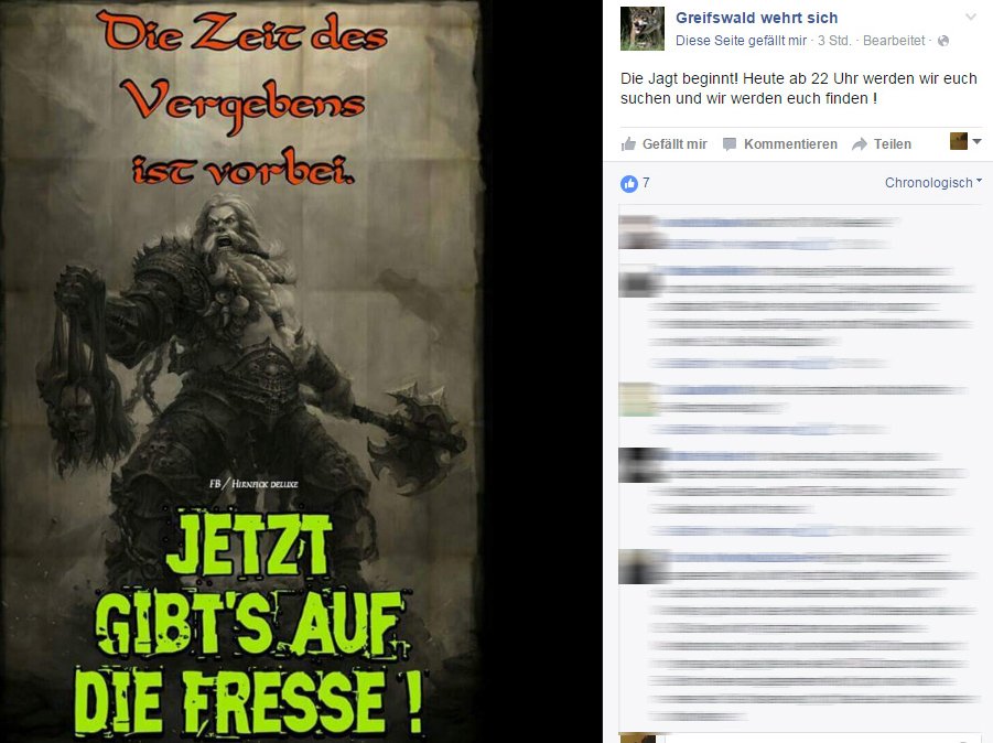 Mit einer handfesten Drohung kehrte die Gruppe „Greifswald wehrt sich“ heute Nachmittag aus ihrer Versenkung zurück und kündigte auf Facebook körperliche Übergriffe an.