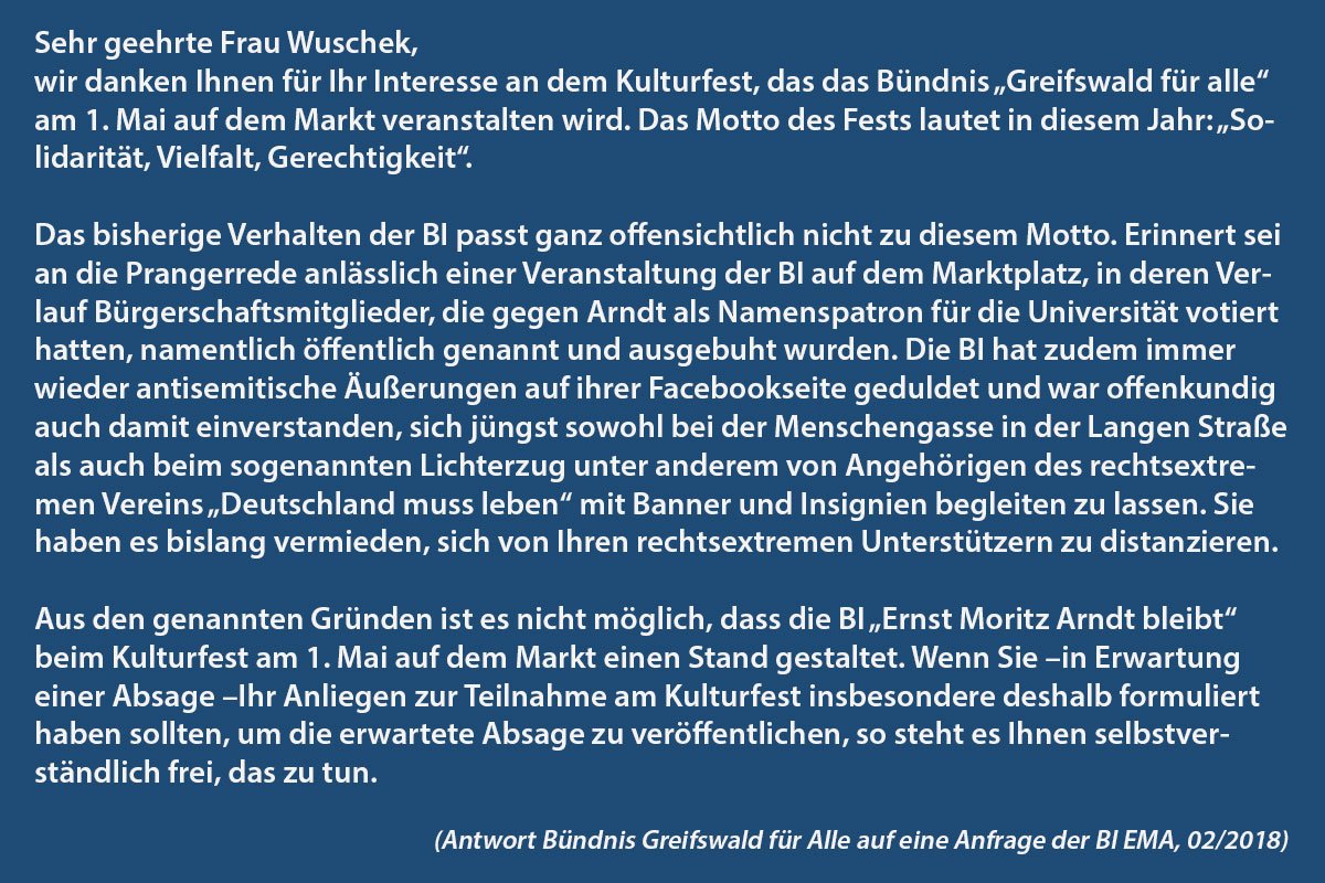 Die BI „Ernst Moritz Arndt bleibt“ ihrerseits kann sich dafür entscheiden, weiterhin mit zweifelhaften Typen unterwegs zu sein: Das steht ihr frei. Ganz sicher aber hat sie, soweit ihr bisheriges Auftreten Rückschlüsse zulässt, auf einem Fest, das unter dem Motto „Vielfalt, Solidarität, Gerechtigkeit“ steht, nichts verloren. Das wäre geradezu ein Affront gegen all die ernstzunehmenden Initiativen, Vereine, Organisationen gewesen, die am Dienstag auf dem Markt gemeinsam gefeiert haben. Von den über 3000 Menschen guten Willens, die als Besucher kamen, ganz zu schweigen.