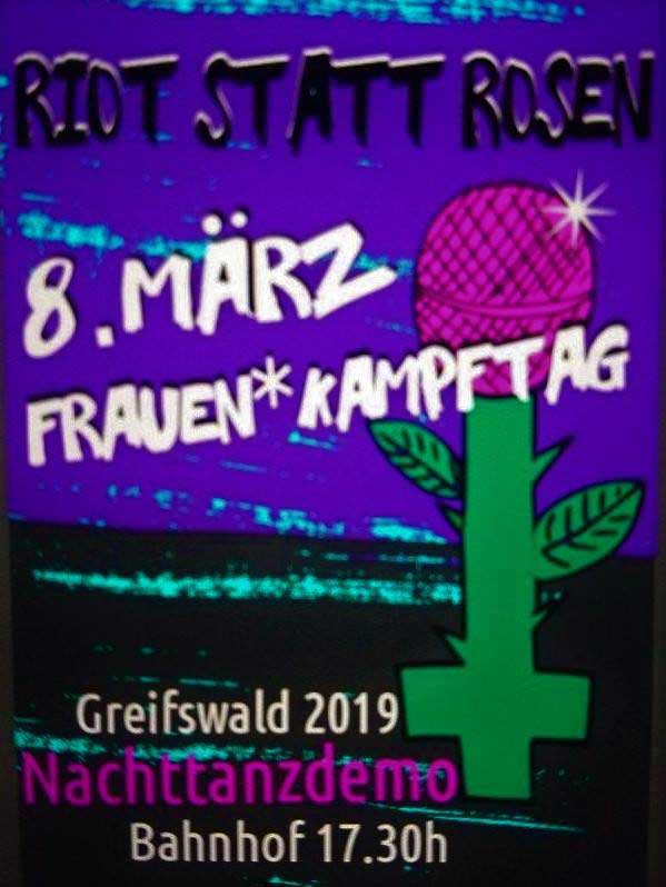 Am Internationalen Frauentag findet in Greifswald eine Nachttanzdemo statt. Unter dem Motto dem Motto „Ich will keine Rosen, ich will anerkannte Rechte!“ wird eine stärkere Gleichstellung von Frauen und queeren Personen eingefordert.