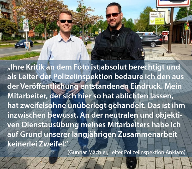 Der Beitrag der Linksjugend wurde zeitnah vom Leiter der Polizeiinspektion Anklam, Gunnar Mächler, kommentiert. Dieser räumte den Fehler ein: „Ihre Kritik an dem Foto ist absolut berechtigt und als Leiter der Polizeiinspektion bedaure ich den aus der Veröffentlichung entstandenen Eindruck. Mein Mitarbeiter, der sich hier so hat ablichten lassen, hat zweifelsohne unüberlegt gehandelt. Das ist ihm inzwischen bewusst. An der neutralen und objektiven Dienstausübung meines Mitarbeiters habe ich auf Grund unserer langjährigen Zusammenarbeit keinerlei Zweifel.“