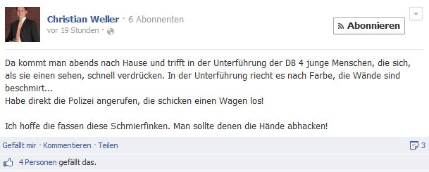 Christian Weller war auf dem Nachhauseweg in einer Bahnunterführung, als er offenbar vier „junge Menschen“ dabei störte, die Wände des Tunnels zu besprühen. Die mutmaßlichen Sprayer verschwanden eilig. Weller tat seine Bürgerpflicht und alarmierte die Polizei, die ihm versprach, der Sache nachzugehen. Zu Hause angekommen, teilte er diese Angelegenheit der Welt in einem kurzen Facebook-Eintrag mit, in dem er sich einen konsequenten Umgang mit den jungen Delinquenten wünschte: „Ich hoffe die fassen diese Schmierfinken. Man sollte denen die Hände abhacken!“