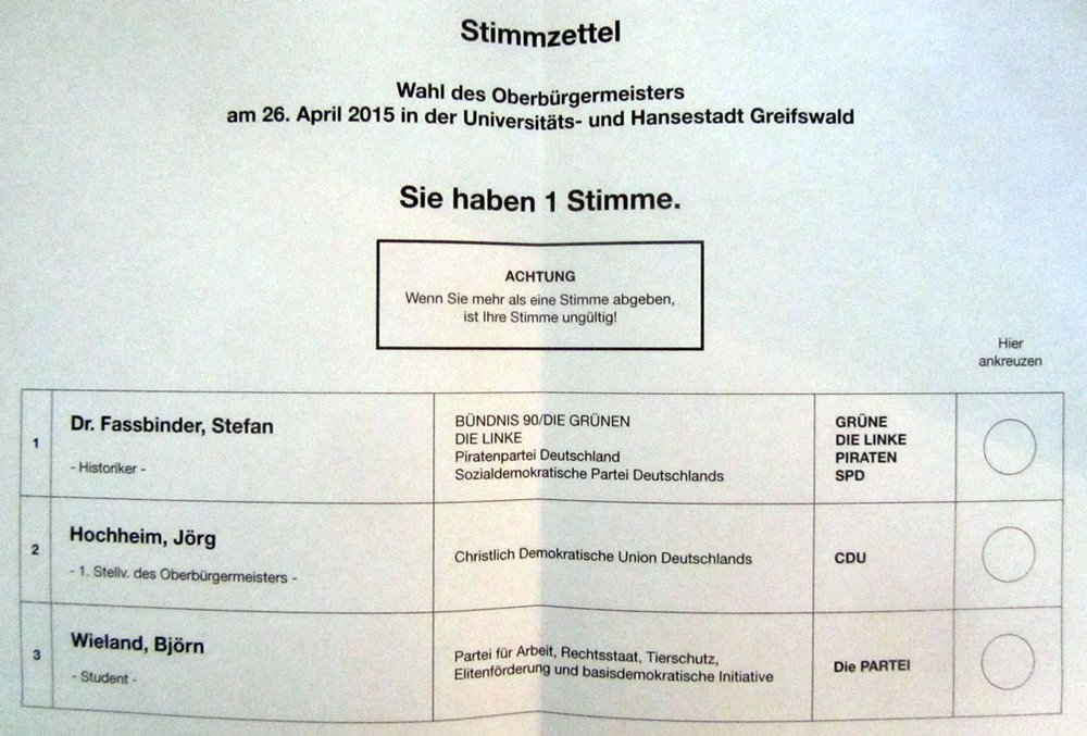 Am Sonntag wird in Greifswald ein neuer Oberbürgermeister gewählt. Die Vorbereitungen zur Durchführung des Votums laufen auf Hochtouren. Zur Wahl gestellt haben sich drei Kandidaten: der derzeitige Baudezernent Jörg Hochheim (CDU), der Lehramtsstudent Björn Wieland (Die PARTEI) sowie der Historiker Stefan Fassbinder (Grüne), der als gemeinsamer Kandidat von Grünen, SPD, Linke und Piratenpartei ins Rennen geschickt wurde.