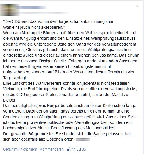 In der Facebook-Gruppe „Was Greifswalder bewegt“ wird ein Gerücht aus „zuverlässiger Quelle“ über die Position der Greifswalder CDU zur zitierten Beschlussvorlage kolportiert, dem zufolge die Christdemokraten den Gang vor das Verwaltungsgericht planen würden — und dies sowohl für den Fall, dass die Bürgerschaft die eingelegten Einsprüche zurückweisen sollte, als auch dann, wenn ein Wahlprüfungsausschuss eingesetzt würde, der zu einem ähnlichen Schluss käme.