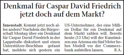 Die Nachricht verbreitete sich bereits in den vergangenen Tagen, nun freut sich auch die CDU Greifswald auf ihrer Internetpräsenz. Das geplante Denkmal für den in Greifswald geborenen Maler Caspar David Friedrich hat nämlich jetzt spürbaren finanziellen Rückenwind bekommen.