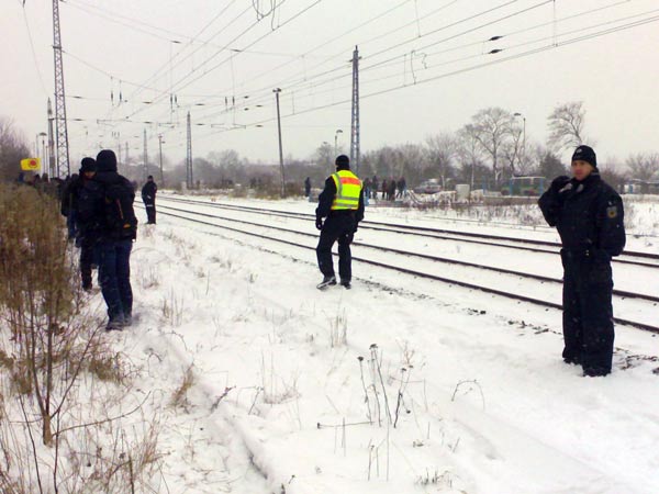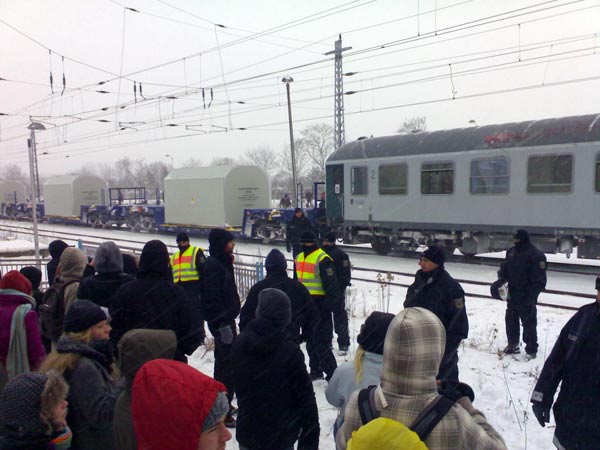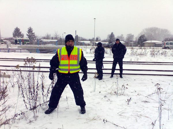 Beim Versuch, auf die Gleise zu gelangen, wurden mehrere Atomgegner von Polizisten angegriffen, die Konsequenz und die Bereitschaft zu hartem Durchgreifen demonstrierten, sich ansonsten aber ruhig verhielten. Der Castor-Transport wurde heute durch mehrere zum Teil sehr erfolgreiche Blockaden von Greenpeace und Robin Wood verzögert.