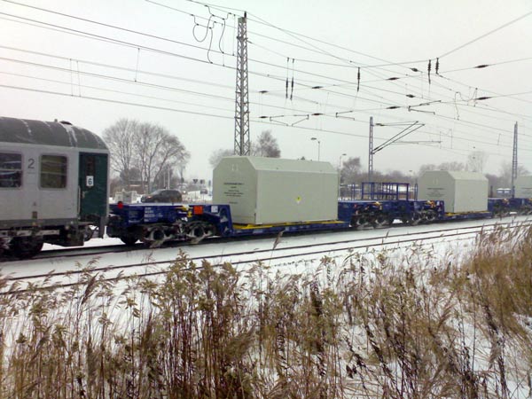 Aufgehalten wurde die höchst umstrittene Lieferung vor allem auf dem letzten Abschnitt zwischen Greifswald und Lubmin. Hier sorgte eine spektakuläre Aktion der Umweltorganisation Robin Wood für eine fast sechsstündige Verzögerung. Zwei Aktivistinnen ketteten sich dabei bereits um 13 Uhr an einen Betonklotz im Gleisbett – die zuletzt vom Gleis entfernte Demonstrantin harrte dort insgesamt siebeneinhalb Stunden in der Kälte aus.