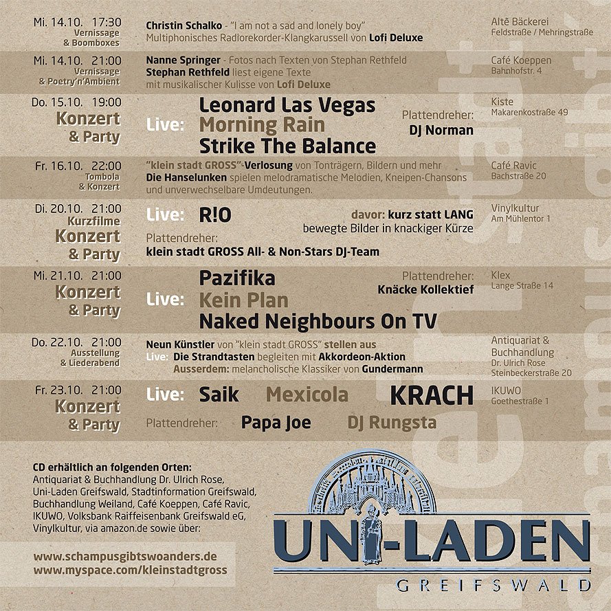 Eine Woche ist seit der Veröffentlichung des lokalen Samplerprojektes klein stadt GROSS ins Land gezogen, viele CDs wurden verkauft. Greifswald wurde mit mehreren Konzerten und Ausstellungen belebt. Das Lokalfernsehen hat inzwischen einen zweiten Beitrag dem Projekt gewidmet.