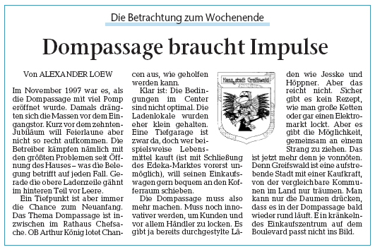 Alexander Loew ermuntert in seiner Betrachtung zum Wochenende dazu, gemeinsam an einem Strang zu ziehen, um die Passage wieder aufzuwerten. Da ziehe ich mit: am anderen Ende des Strangs. Dieser Zweckbau ist eine ästhetische Beleidigung. Die Probleme des Konzepts Konsumpassage sind nicht nur Greifswalder Natur, sie stehen symptomatisch für eine verfehlte Stadtplanungspolitik, besonders in den neuen Bundesländern. Das Centermanagement hat es versäumt, die ohnehin leerstehende Fläche durch mutige Ideen zu nutzen.
