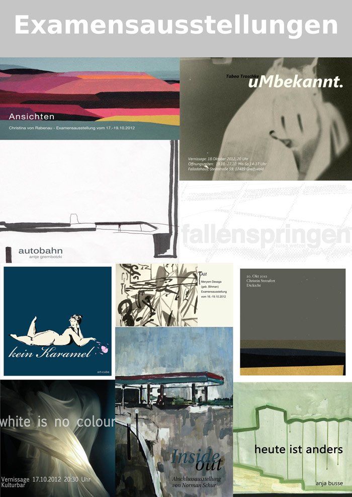 Insgesamt neun Abschlusspräsentationen werden in diesem Semester von den Absolventinnen des Caspar-David-Friedrich-Instituts an der Universität Greifswald gezeigt. Die Ausstellungen, bei denen die Studentinnen Arbeiten aus fünf verschiedenen künstlerischen Bereichen — beispielsweise Zeichnung, Malerei oder Videoinstallation — zeigen müssen, markieren die Zielgerade ihres Kunststudiums.