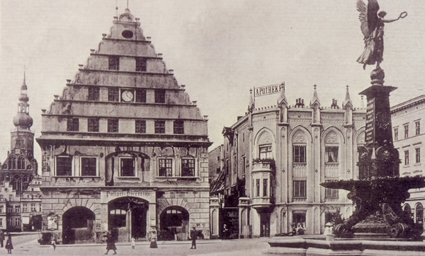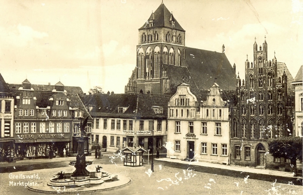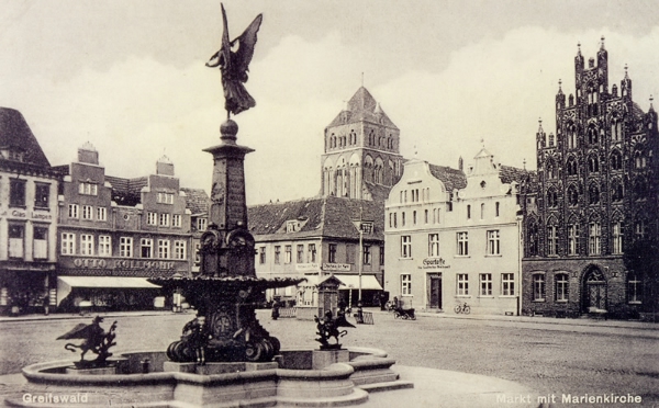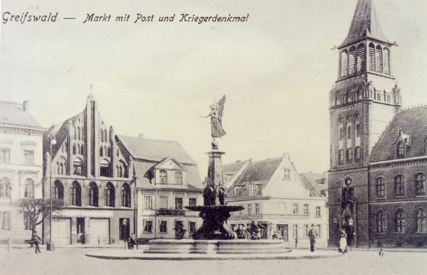 Die Ostsee-Zeitung präsentierte heute unterschiedliche Vorschläge für die zukünftige Beschaffenheit des Platzes, die von der Wiederanpflanzung von Bäumen über die Errichtung eines Spielplatzes oder einer Friedrichschen Figurengruppe bis zum Aufstellen eines Brunnens reichen. Letzterer ist nun auch Gegenstand einer OZ-Umfrage, bei der die Leserinnen über einen Brunnen auf dem Marktplatz abstimmen sollen. Wer nach den Dreißiger Jahren geboren wurde, kann sich den Greifswalder Marktplatz vielleicht nur schwer mit einem Brunnen in seiner Mitte vorstellen, doch von 1892 bis 1936 stand dort so einer schon mal als Kriegsdenkmal.