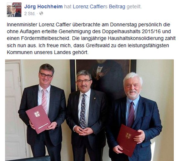 Es ist Wahlkampf, da wird natürlich um jede positive mediale Darstellung des eigenen Kandidaten und um jede euphorische Mitteilung bei Facebook geworben. Für Innenminister Caffier bedeutete das in diesem Fall einen zusätzlichen Ortstermin, den er kurzfristig — das heißt, nach Bekanntgabe des knappen Greifswalder Wahlergebnisses und der notwendigen Stichwahl — einschieben musste. Diese Kurzfristigkeit lässt sich beispielsweise daran ablesen, dass der Besuch in Greifswald nicht bei den offiziellen Terminmeldungen vor der Wahl (PM-Nr. 76/2015) auftauchte, sondern erst in einem fast identischen Dokument, das am Dienstag nach der Wahl einfach nochmal unter der gleichen Nummer (76/2015) verschickt wurde, obwohl die Dokumentenzählung zu diesem Zeitpunkt bereits bei Nummer 81 war. Das lässt sich nur noch über Googles Webcache rekonstruieren, denn die Terminmeldungen 76/2015 wurden angepasst und aktualisiert.