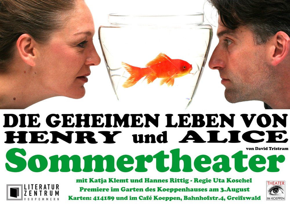 Manchmal kommt man jedoch nicht umhin, sich der Komödie – in diesem Fall eher der Tragikomödie – zu stellen. So geschehen am letzten Wochenende, als mein Chef wieder seiner wahren Berufung folgte und sich beim Sommertheater zum Henry machte. Im Hof des Café Koeppen wurde auch bei der zweiten Aufführung jede Sitzgelegenheit von einem sehr gemischten Publikum in Beschlag genommen, um sich Die geheimen Leben von Henry und Alice anzusehen.