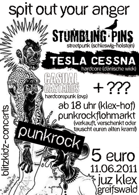 Anschließend geht es im Konzertsaal mit den Stumbling Pins aus Schleswig-Holstein, den regional angesiedelten Casual Bastards und der Greifswalder Punkhoffnung Tesla Cessna, die als terrortorialen Bezugspunkt die Dänische Wieck angeben, weiter.