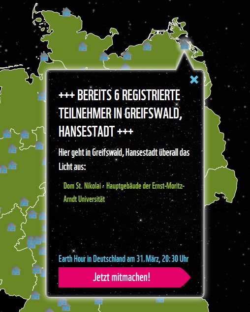 Vor einem Jahr machten insgesamt 5252 Städte bei der Earth Hour mit — davon allerdings nur 66 aus Deutschland — und waren so Teil der „größten globalen Demonstration für den Schutz des Planeten, die es je gab“, wie in der Pressemitteilung zur Teilnahme berichtet wird.