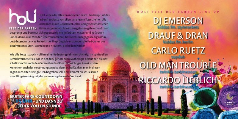 Greifswalder dürfen sich am kommenden Pfingstsonntag einer ganz besonderen Veranstaltung erfreuen, denn das erste Holi, das diese Stadt erleben muss, steht ins Haus und lädt dazu ein, gemeinsam mit vielen Jugendlichen auf einem Elektro-Open-Air das mühsam Ersparte, das sonst immer so knapp ist, zu verpulvern.